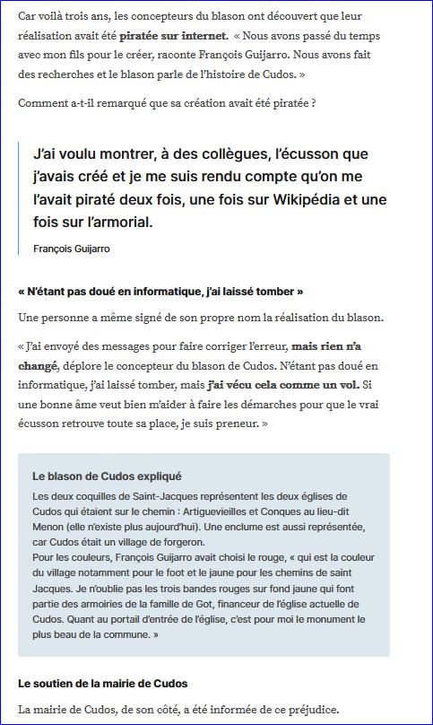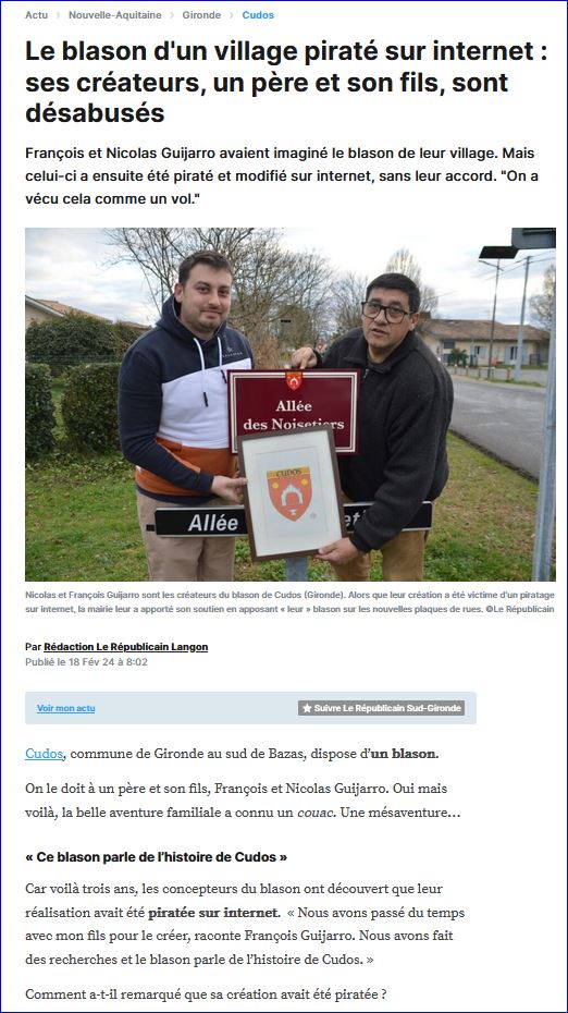 Un article de presse de Le Républicain (Sud-Gironde) du 18 février 2024 (site du journal) nous accuse de "piratage", de "vol" par les concepteurs du blason de la commune!