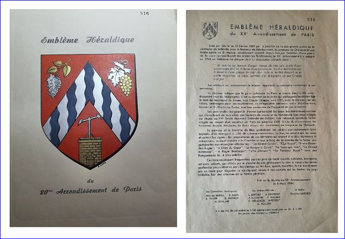 Une correspondante souhaite mettre en vente un document numéroté (tirage limité) concernant le blason du 20e arrondissement de Paris, signé R.Louis et daté de 1944.
