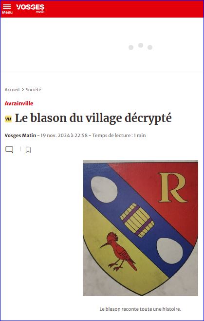 Un article du journal Vosges Matin du 19 novembre 2024, montre un blason attribué à la commune d'Avrainville.