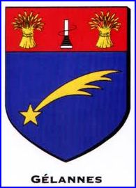 D'azur à la comète d'or posée en barre et filant vers la pointe; au chef cousu de gueules chargé d'un bobinon d'argent accosté de deux gerbes de blé d'or.