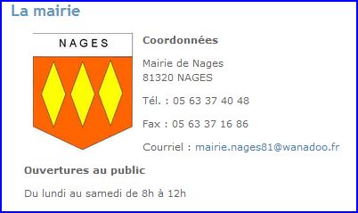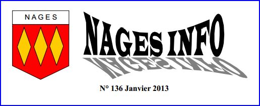 De gueules à trois fusées d'or rangées en fasce, au chef d'argent chargé de l'inscription « NAGES » en lettres capitales de sable.
