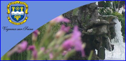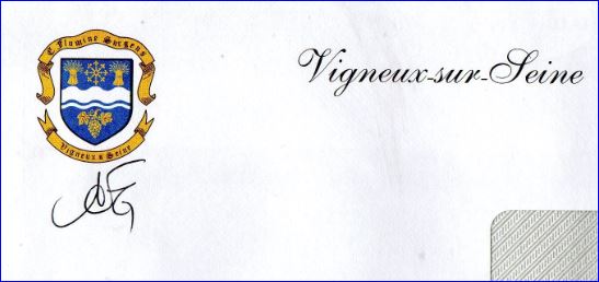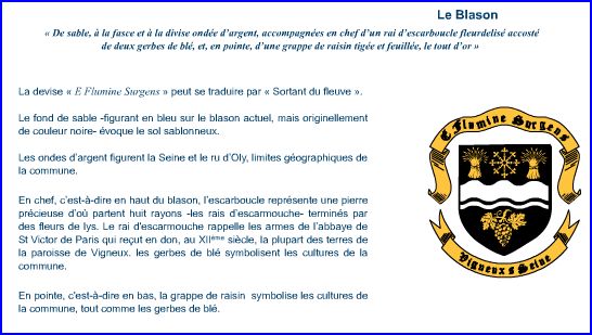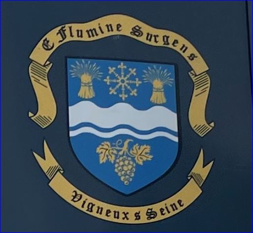 De sable à la fasce soutenue d'une divise, ondées d'argent, surmontées d'un rais d'escarboucle fleurdelisé accosté de deux gerbes de blé et soutenues d'une grappe de raisin tigée et feuillée, le tout d'or.