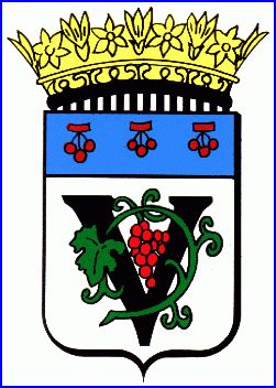 D'or à lettre capitale V de sable et au sarment de vigne de sinople fruité de gueules brochant; au chef d'azur chargé de trois grappes de trois cerises cousues de gueules.