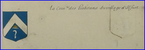(fin XVIIe s.) D'azur au chevron haussé d'argent accompagné en pointe d'un pont de quatre arches d'or posé sur une rivière isolée d'argent, soutenu par une serpette du même posée en pal.