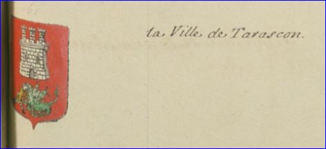 (v. 1458) Coupé: au 1er de gueules au château donjonné de trois tourelles d'argent, ouvert (du champ), ajouré et maçonné de sable, posé sur la partition , au 2e d'azur à la tarasque [dragon monstrueux à six pattes] d'or avalant un homme d'argent.