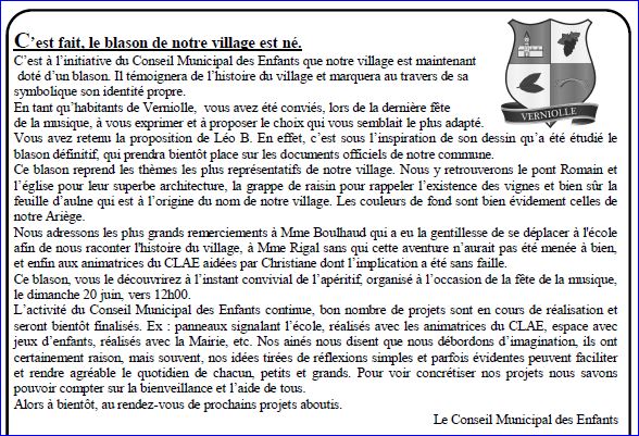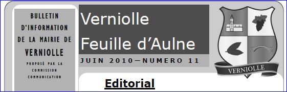 (2010) Écartelé: au 1er de gueules à l'église du lieu d'or, au 2e d'or à la grappe de raisin de pourpre feuillée de sinople, au 3e d'or à deux feuilles de vergne de sinople posées en chevron couché, au 4e de gueules au pont isolé d'une arche d'or, maçonné de sable.