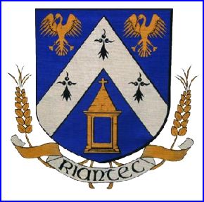 D'azur au chevron d'argent chargé de trois mouchetures d'hermine de sable posées à plomb, accompagné en chef de deux cormorans éployés d'or, becqués de gueules et en pointe d'une fontaine couverte et croisetée d'or, ouverte du champ.