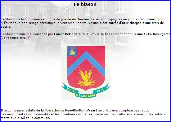 L'époque voulait qu'on intégrât les croix de guerre dans les armes-mêmes, ce que fit alors Neuville-Saint-Vaast dans un franc-quartier d'azur, avant de les appendre à l'écu, comme il se doit désormais. Le phénix, comme la devise "