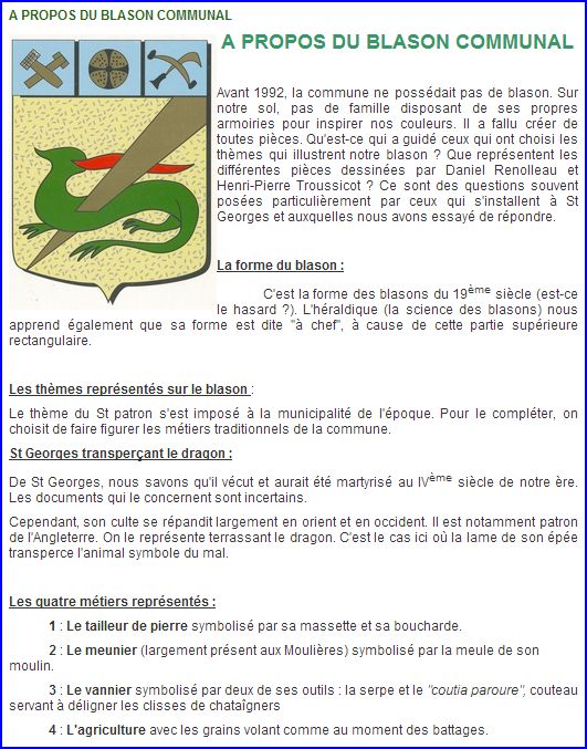 (2001) D'or semé de grains non ordonnés au naturel, au dragon désailé de sinople, regardant, crachant des flammes de gueules, transpercé par une pile diminuée et posée en barre du champ; au chef d'azur tiercé en pal chargé au 1er d'une massette et d'une boucharde d'or passées en sautoir, au 2e d'une meule de moulin du même surchargée d'une croix pattée de sable, au 3e d'une serpe et d'une plane d'or emmanchées de sable et passées en sautoir.