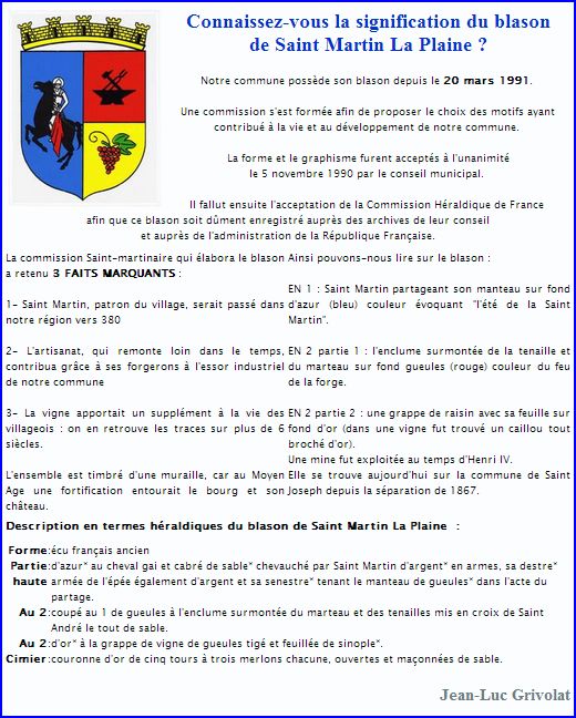 (1990) Parti: au 1er d'azur à saint Martin d'argent, sur un cheval gai, cabré de sable, partageant de son épée d'argent son manteau de gueules, au 2e coupé au I de gueules à un marteau et une paire de tenailles de forgeron passés en sautoir et à l'enclume brochant en pointe, le tout de sable, au II d'or à la grappe de raisin de gueules, tigée, feuillée et vrillée de sinople.