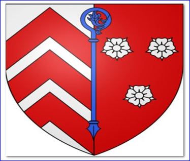 Parti: au 1er d'argent à trois chevrons de gueules, au 2e de gueules à trois roses d'argent; à la crosse abbatiale contournée d'azur brochant sur le tout.
