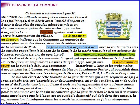 Le fond burelé d’argent et d’azur avec la couleur des clés de gueules rappellent le blason de la famille de la Rochefoucault qui a été seigneur de Gesvres pendant 114 ans de 1394 à 1508 (