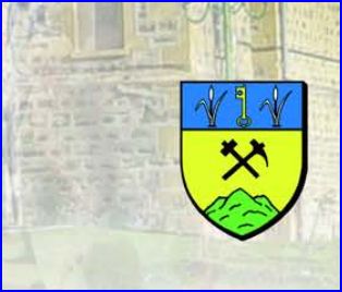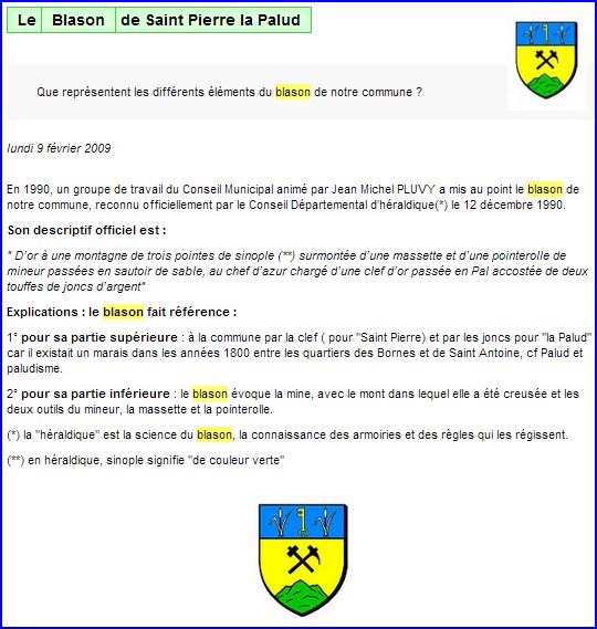 (1990) D'or à la montagne de trois points de sinople mouvant de la pointe et surmontée d'une massette et d'une pointerolle de mineur de sable, passées en sautoir; au chef d'azur chargé d'une clé d'or accostée de deux roseaux à massette, tigés et feuillés d'argent.