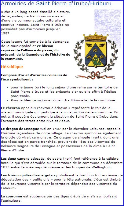 (1987) D'or au chevron d'azur chargé de trois coquilles de limaçon d'or; accompagné en chef de deux canons adossés de sable et en pointe d'un dragon dépourvu d'ailes, à trois têtes, de sinople, lampassées de gueules, dont celle de dextre est en partie tranchée et d'où s'échappent deux gouttes de sang de gueules.