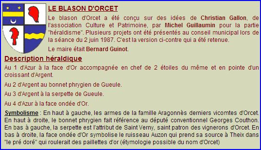 (1987) Écartelé: au 1er d'azur à la fasce d'or surmontée de deux étoiles du même et soutenue d'un croissant d'argent, aux 2e d'argent au bonnet phrygien de gueules, au 3e d'argent à la serpette de gueules posées en pal, au 4e d'azur à la fasce ondée d'or.