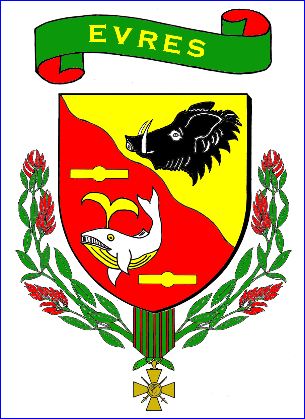 (2013) Tranché ondé: au 1er d'or à la hure de sanglier de sable allumée et défendue d'argent, au 2e de gueules à la baleine d'argent, l'évent soufflant un jet d'or, accostée de deux billettes nouées du même, posées en fasce et rangées en bande.