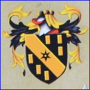De sable à la bande d'or chargée d'une violette de sable, accompagnée de six billettes d'or ordonnées en orle, trois en chef, trois en pointe.