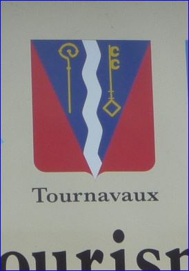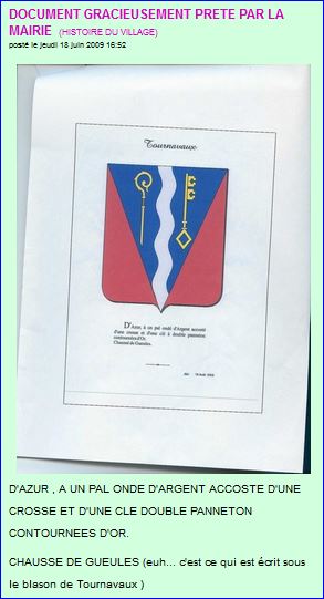 D'azur au pal ondé d'argent, adextré dune crosse, senestré d'une clé à double panneton, toutes deux d'or et contournées; chaussé de gueules.