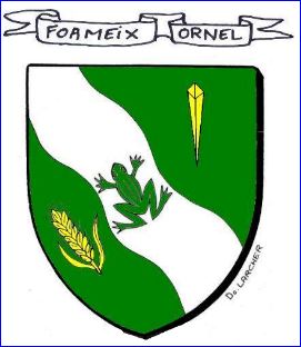 (2013) De sinople à la bande ondée d'argent chargée d'une grenouille de sinople, accompagnée en chef d'un clou de la Passion d'or et en pointe d'un épi de blé posé en bande du même.