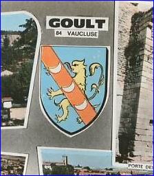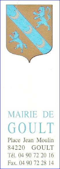 D'or à la bande d'azur chargée de trois croissants d'argent et accompagnée, en chef, d'un lion d'azur lampassé de gueules et, en pointe, d'un loup d'azur lampassé, armé et vilené de gueules.