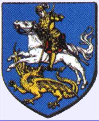 D'azur à saint Georges de carnation, armé d'or de pied en cap, sur un cheval d'argent sellé de gueules, bridé d'or, transperçant de sa lance d'or un dragon du même.
