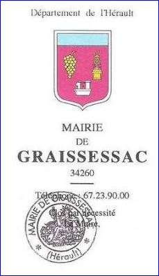 De gueules à la machine à fabriquer les clous d'argent, en pointe, surmontée d'une grappe de raisin à dextre et d'une lampe de mineur à senestre, le tout d'or; au chef cousu d'azur.