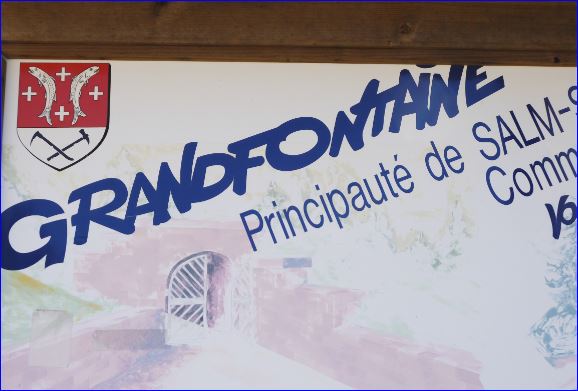 De gueules à deux saumons adossés d'argent accompagnés de quatre croisettes du même; à la champagne d'argent chargée d'un pic et d'une masse de mineur de sable passés en sautoir.