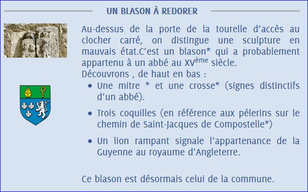 D'azur à trois coquilles d'argent ordonnées 2 et 1 à dextre et au lion du même à senestre; au chef cousu de sinople chargé à dextre d'une mitre d'or et à senestre d'une crosse contournée du même mouvant du trait du chef.