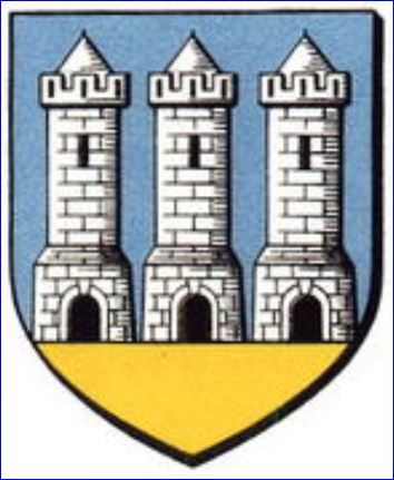 D'azur à trois tours crénelées et couvertes d'argent, ouvertes, ajourées et maçonnées de sable, posées sur une terrasse d'or.