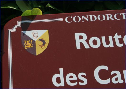 Tiercé en pairle: au 1er d'argent au buste contourné et posé de trois-quarts d'Antoine de Caritat, marquis de Condorcet, au trait de gueules, au 2e d'azur au dragon contourné d'or, lampassé de gueules et armé de sable, au 3e d'or au dauphin d'azur, barbé, crêté, lorré, oreillé et peautré de gueules.