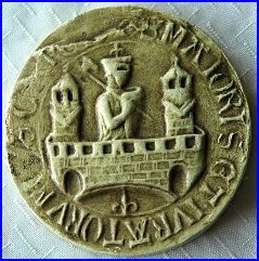 Sur ce sceau, le maieur, revêtu d'une cotte de mailles, la hache d'arme sur l'épaule, se tient sur un pont crénelé, surmonté à ses extrémités de deux tourelles. Ce sceau montre l'importance du bourg pour la défense du passage de la Somme.