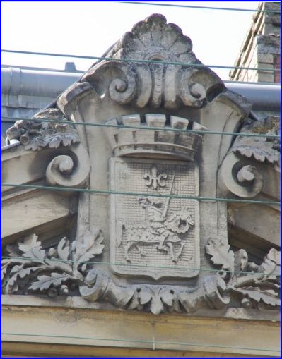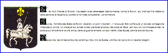 De sable au cavalier armé et contourné d'argent, caparaçonné d'hermines et tenant de la main dextre une lance d'argent, surmonté d'une fleur de lis d'or.