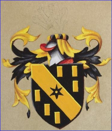 De sable à la bande d'or accompagnée de six aiglettes d'or trois en chef et trois en pointes, ordonnées en orle.