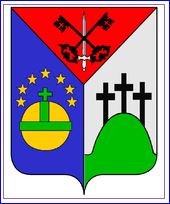 Tiercé en pairle: au 1er de gueules à l'épée d'argent et à deux clés de sable passées en sautoir et brochantes, au 2e d'azur au monde d'or cintré et croiseté de sinople surmonté de sept étoiles d'or ordonnées en demi-cercle, au 3e d'argent a mont de sinople sommé de trois croix latines de sable.