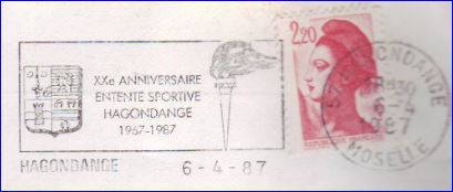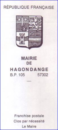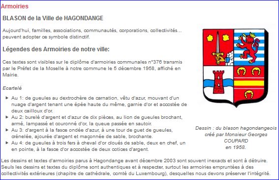 (1958) Écartelé: au 1er de gueules au dextrochère de carnation, vêtu d'azur, mouvant d'une nuée d'argent, tenant une épée du même, garnie d'or, accostée en chef de deux cailloux du même,au 2e burelé d'argent et d'azur, au lion à la queue fourchée de gueules, armé, lampassé et couronné d'or, au 3e d'argent à la fasce ondée d'azur, à la tour de gueules, ajourée d'argent, maçonnée de sable brochant sur le tout, au 4e de gueules à la fasce d'or, accostée de deux cotices d'argent et accompagnée de trois fers à cheval d'or.