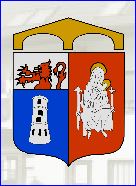 Parti: au 1er d'azur à la tour d'argent ajourée de sable, au chef d'argent au lion issant de gueules, au 2e de gueules à la Vierge à l'Enfant assise sur un trône d'argent, les deux auréolés d'or.