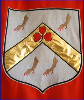 D'azur au chevron d'or chargé d'un trèfle de gueules, accompagné de quatre pattes de lion d'or armées de gueules, deux en chef et deux en pointe.