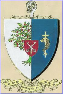 Parti: au 1er mi-parti d'argent au pommier de sinople fruité de gueules, au 2e d'azur à la croisette latine d'or, le pied entortillé d'un dauphin du même; sur le tout, de gueules à deux clés affrontées d'argent, passées en sautoir et brochant sur une épée haute du même.