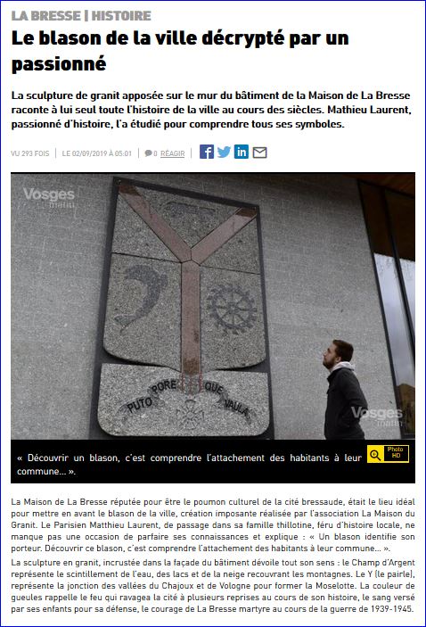Article de presse Vosges Matin du 2 septembre 2019, (site du journal) (1/2).
