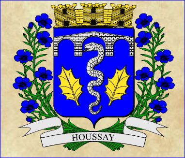 (2000) D'azur à la couleuvre d'argent ondoyant en pal, la tête enfermée en chef à l'intérieur de la voûte centrale d'un pont de trois arches d'argent, maçonné de sable, et accostée de deux feuilles de houx d'or, celle de dextre posée en bande et celle de senestre en barre.