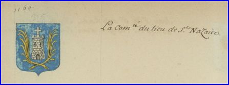 (1697) D'azur à une tour d'argent maçonnée, ouverte et ajourée de sable, sommée d'une croisette d'argent et accostée de deux palmes d'or, les tiges passées en sautoir.