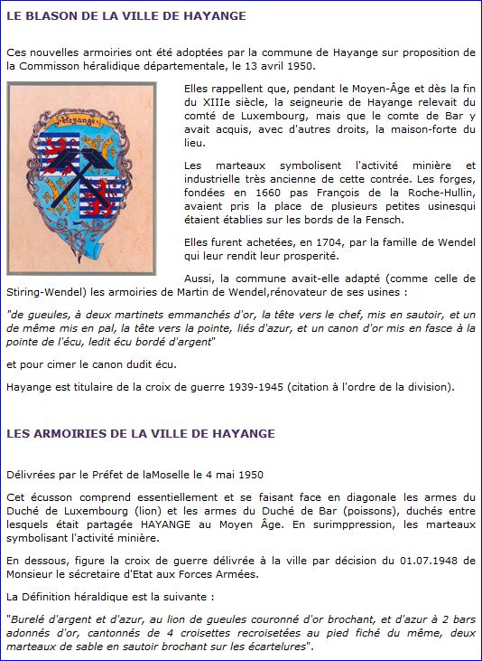 (1950) Écartelé: aux 1er et 4e burelé d'argent et d'azur, au lion de gueules à la queue fourchue et passée en sautoir, lampassé et couronné d'or, aux 2e et 3e d'azur à deux bars adossés d'or, cantonnés de quatre croisettes recroisetées au pied fiché du même; à deux marteaux de sable passés en sautoir brochant sur le tout.