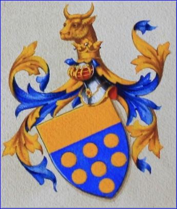 D'azur à sept besants d'or ordonnés 3, 3 et 1; au chef d'or chargé d'une croix ancrée de gueules.