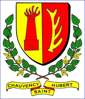 Parti: au 1er d'or au haut-fourneau flamboyant de gueules; au 2e de gueules à la demi-ramure de cerf posée en pal.