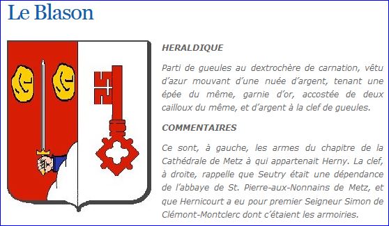 Parti: au 1er de gueules au dextrochère de carnation, vêtu d'azur, mouvant d'une nuée d'argent, tenant une épée du même, garnie d'or, accostée en chef de deux cailloux du même, au 2e d'argent à la clef de gueules.