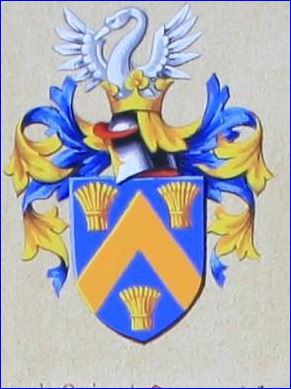 Écartelé: aux 1er et 4e d'azur au chevron d'or accompagné de trois gerbes de blé du même, aux 2e et 3e d'argent à l'aigle de sable.