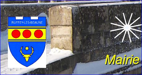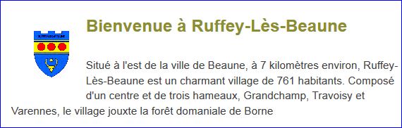 D'azur à la fasce haussée d'or chargée de trois tourteaux de gueules, accostée de burelles d'or, accompagnée, en chef, de l'inscription d'argent «RUFFEY-LES-BEAUNE» surmontée de deux pals retraits du même, et, en pointe, d'un rencontre de cerf d'or surmonté d'une étoile renversée du même.