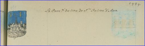D'azur au bourg d'argent, essoré de sable, bâti sur le bord d'une rivière d'argent, et surmonté des lettres capitales S et I d'or séparées par un point du même.