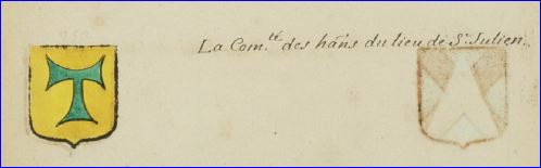 Tiercé en bande: au 1er d'or au tau de sinople, au 2e de gueules à la bande d'or et à trois cloches d'argent rangées en bande et brochantes, au 3e de sinople à trois pals d'or.