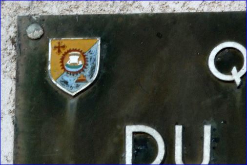 Taillé: au 1er d'or à la croix cléchée, pommetée de douze pièces d'or et remplie de gueules, au 2e d'azur au fort Saint Charles du lieu d'or, (essoré de gueules,) sur une terrasse isolée de gueules et maçonnée de sable; au besant dentelé d'or à la bordure de gueules brochant sur la partition, chargé d'un bateau équipé de sinople (du même), habillé d'argent, ayant à la barre un oiseau du même et voguant sur une mer d'azur agitée de sable, au listel d'argent chargé de l'inscription NOVA VELLA en lettres capitales de sable brochant en chef sur le mât.